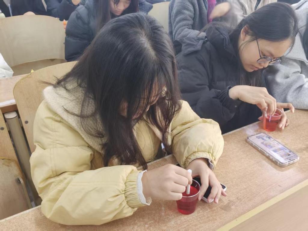 活动中,主持人以图文并茂的形式系统阐释了毛细现象的基本原理,通过具体实例展示了毛细现象的作用机制。在操作环节,同学们以粉笔、彩色溶液等常见的日常材料作为实验载体,观察不同颜色液体在粉笔中的爬升速度、条纹分布等实验现象。同学们踊跃分享实验现象与心得体会,活动氛围热烈。